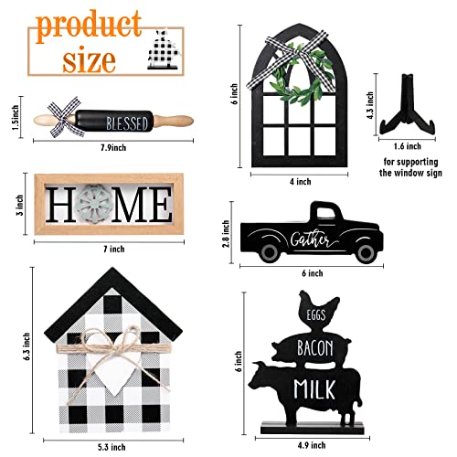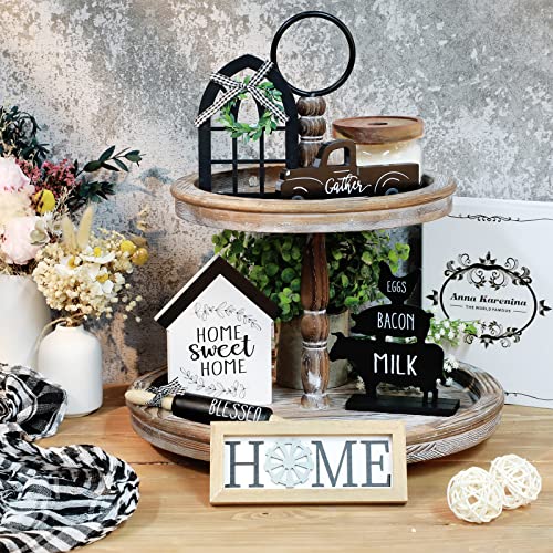 Specification: 7 Pcs Tiered Tray Decoration Buffalo Plaid Rustic Farmhouse Tray Signs Double Printed Wooden Shelf Signs Sweet Home Block Signs Black and White Plaid Ornaments for Kitchen Living Room Table Decor