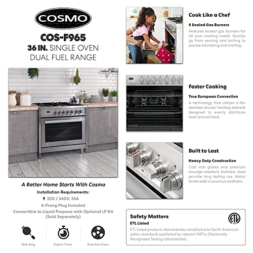 COSMO F965 36 in. 220/240V Dual Fuel Range with 5 Gas Burners, Electric Convection Oven with 3.8 cu. ft. Capacity, 8…